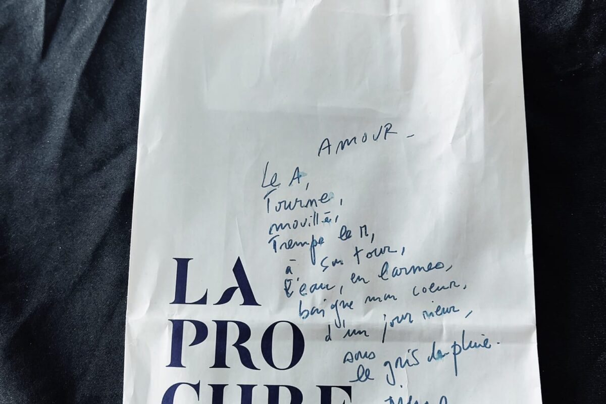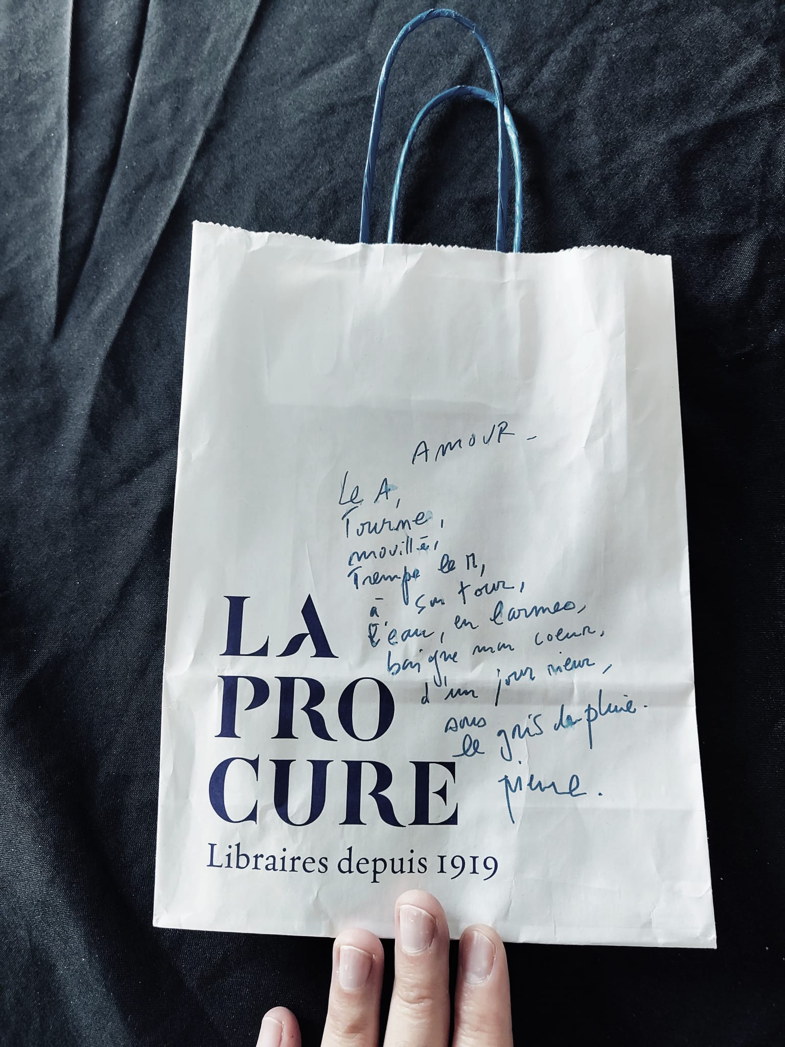 Pierre a souri à son tour. Il a pris un stylo. Et sur le sac blanc de La Procure, entre les lettres imprimées de l’enseigne, il a écrit ceci :