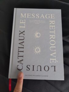 Avant même d’ouvrir Le Message Retrouvé, l’œil rencontre un objet qui refuse la facilité. Sur un fond gris perle d’une sobriété presque minérale, les lettres dorées composent une architecture verticale qui rappelle autant les stèles antiques que les enluminures médiévales. Le titre se déploie en colonnes : MESSAGE et RETROUVÉ encadrent CATTIAUX et LOUIS, disposés en miroir. Cette symétrie n’est pas seulement esthétique, elle est cosmique. Au centre exact de la composition, deux symboles solaires se font face, l’un rayonnant vers le haut, l’autre vers le bas, incarnant visuellement le sous-titre gravé entre eux : « ou l’horloge de la nuit et du jour de Dieu ».
