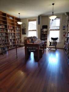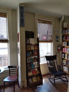 Mais c’est au second étage que mon pèlerinage a trouvé son apothéose. La Poetry Room – cette chambre de poésie perchée sous les combles – m’a saisi par sa beauté tranquille. Baignée d’une lumière dorée filtrée par des stores de bambou, elle offre un contraste saisissant avec l’agitation de Columbus Avenue qui gronde en contrebas.